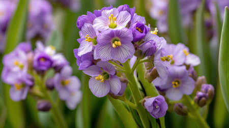 A macro shot reveals a cluster of vibrant purple flowers, their petals displaying intricate vein patterns. The composition highlights the flowers' textures and details with soft lighting. This image might be suitable for illustrating natural beauty, botanical studies, or providing decorative elements in various design projects.