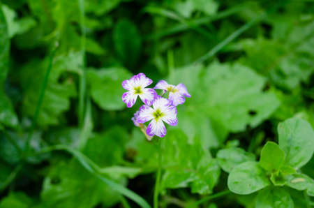 Small lilac flowers on a dark green meadow background