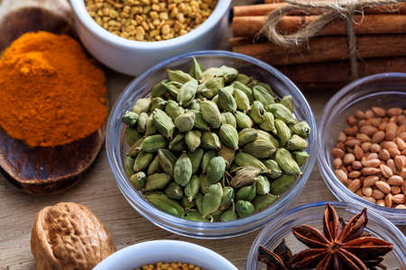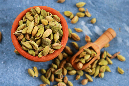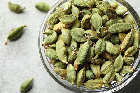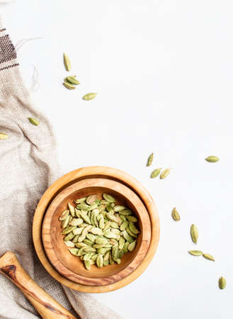 Green cardamon in ceramic bowl among ground scattered spicies on white textured background close-up, top view, selective focus. Exotic indian spice. Aromatic condiment. Healthy eating and dieting concept.