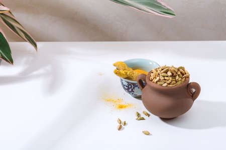 Cardamom in a ceramic pot and turmeric root on a white table. Light background.