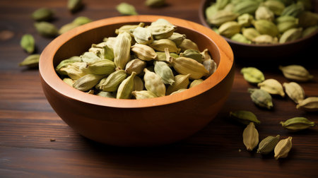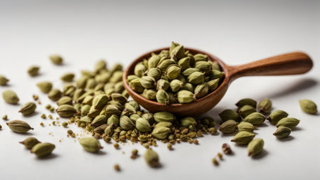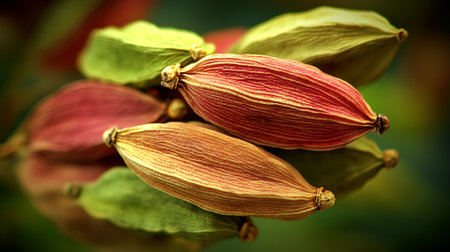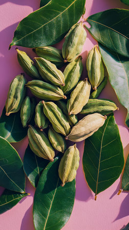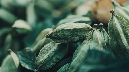 An AI generated illustration of Cardamom pods, a highly aromatic spice cherished in global cooking, especially in Indian and Middle Eastern dishes.