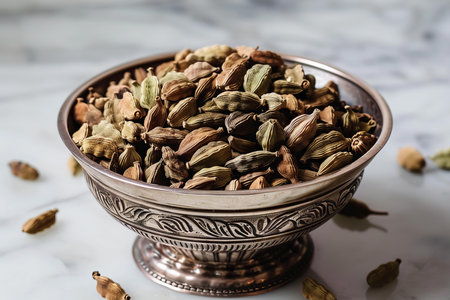 Decorative metal bowl filled with aromatic green cardamom pods on a marble surface