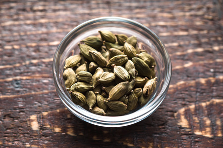 Dried green organic cardamom pods in a bowl on wooden table, closeup and top view.