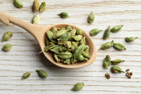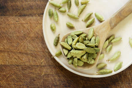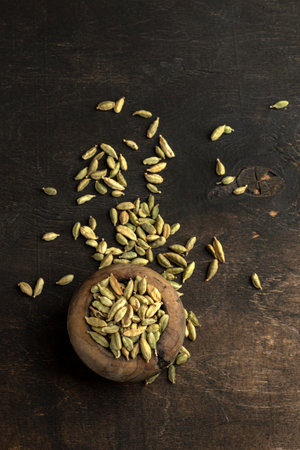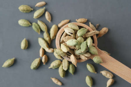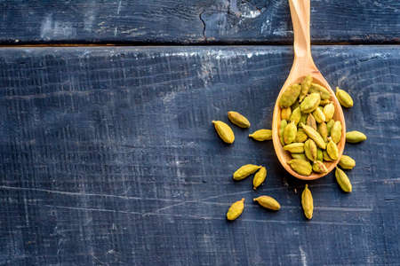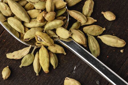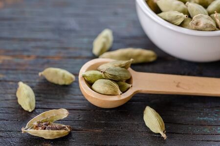 Close up green cardamom seeds in wooden spoon on dark wooden surface