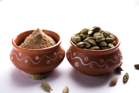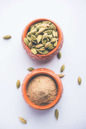elaichi or Cardamom powder in bowl or heap over moody background with pods. selective focus
