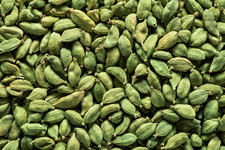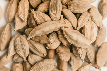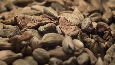Macro Close-up of Whole Dried Green Cardamom Pods (Elettaria cardamomum) Used Globally as a Highly Aromatic and Valuable Spice.