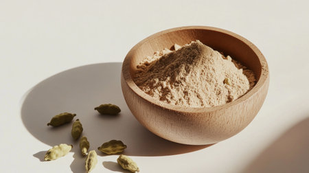 A wooden bowl filled with ground spice showcases a light and airy aesthetic. Perfect for culinary themes, food photography, and wellness concepts.