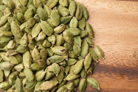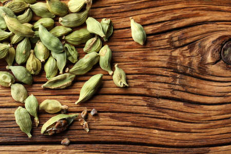 Spice cardamom. Green cardamom grains lie on a wooden plate. Aromatic seasoning for tea, hot chocolate, coffee, cocoa. Tea house, cafe, restaurant, spice shop. Elettaria cardamomum. Dark background