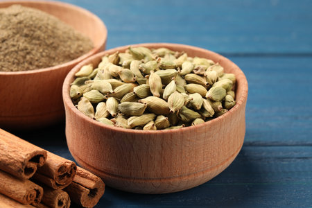 Close up of spice Black cardamom with its powder on blue wooden surface.