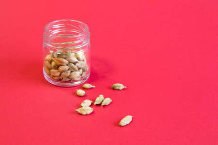 Fresh tasty spices, soft green cardamon Top view close up on red background