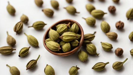 Closeup macro shot of dried green Elettaria cardamomum fruits with seeds, cardamom spice in small bowl on white background organic elaichi herb aromatic ingredient flavor ayurvedic edible herbs spices