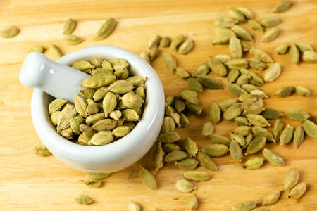 Spice Green Cardamom in white mortar with pestle on wooden background. Green cardamom is a fragrant herb used as an ingredient for cooking.