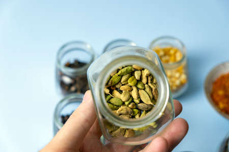 cardamon clay pot, sichuan paper in wood spoon, chilli paper and juniper berry with corn in glass jar