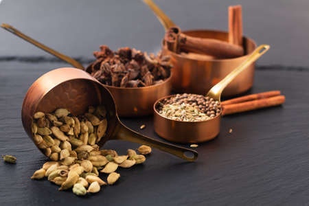 Food concept mix of masala spices, cinnamon, fennel, star anise, coriander seed and cinnamon pods in copper cup on black slate board
