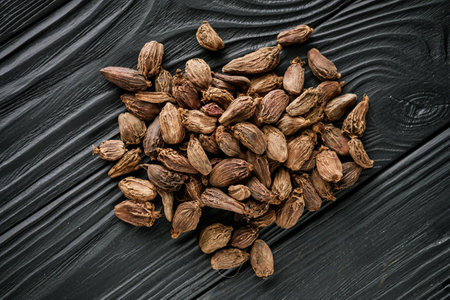Cardamon dry seeds on a black wooden table and metal spoon, flat lay composition, top view.