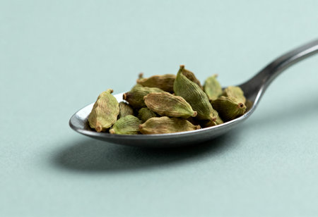 Green cardamom pods heaped on silver spoon with pastel background, aromatic spice for culinary, healthy food, ingredients concept.