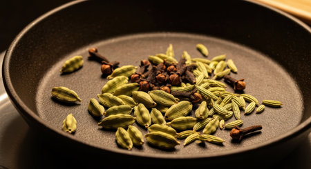 Whole cardamom pods, fennel seeds, and cloves heating in a shallow black pan for aromatic spice preparation in cooking.