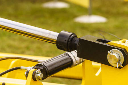 Agriculture equipment concept. Industrial detailed pneumatic, hydraulic silver machinery made of steel.