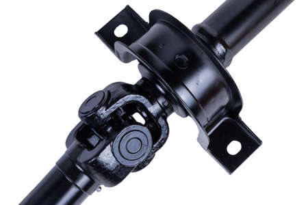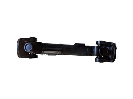 Car driveshaft. Car driveshaft isolated on white background. Detail of the car. New spare parts.