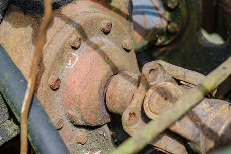 vintage retro tractor rusty details close up. gearbox, levers, viring and mechanical arms with rust and paint leftovers in sunny day