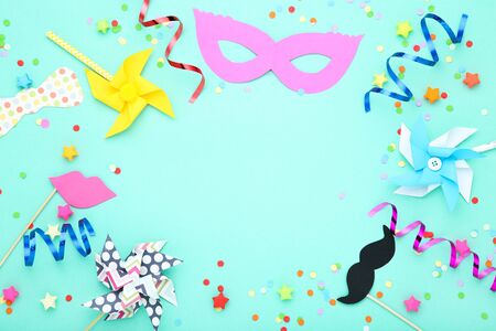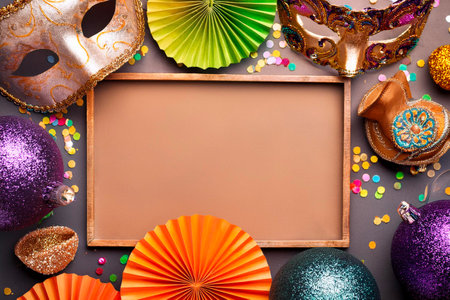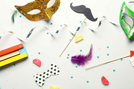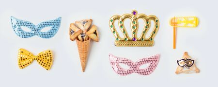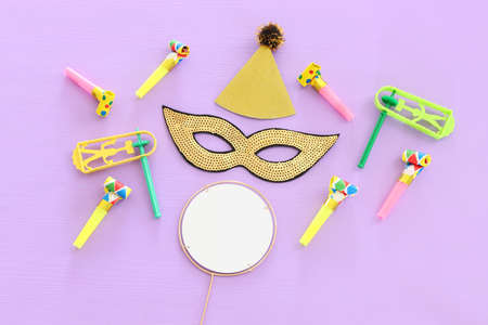 Purim celebration concept. Jewish carnival background. Top view. Flat lay