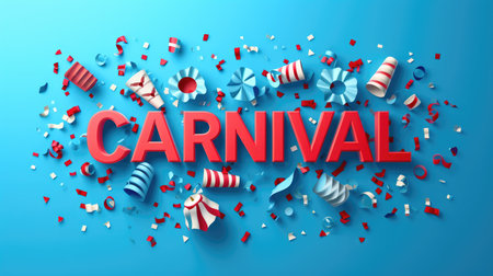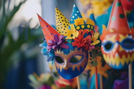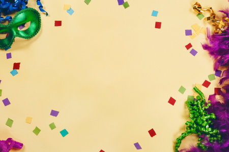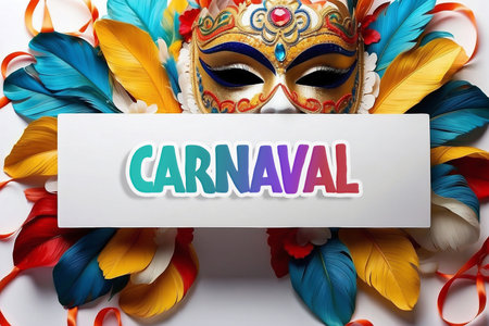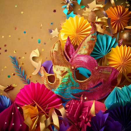 Colorful Brazilian Carnival Mask Amidst Festive Confetti and Streamers. Concept of Cultural Celebration, Artistic Expression, Lively Atmosphere, and Traditional Festivities.. Copy space.