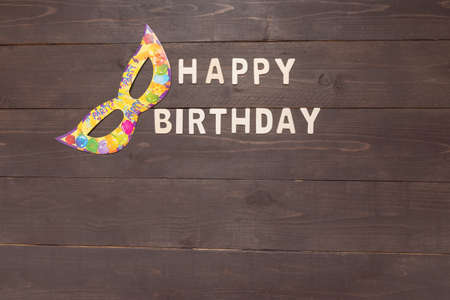 Concept of birthday party with party hats, masks and candles on the yellow background. Top down view with copy space for text