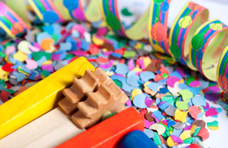 Carnival or birthday party. Confetti and serpentines on white wooden background, blurred frame, top niew,