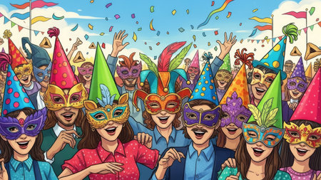 A group of diverse people are gathered in a festive scene. They are wearing a variety of vibrant masks and party hats, suggesting a celebration. The illustration features bright colors and a lively composition. This image might be suitable for editorial use, or for projects related to celebrations.