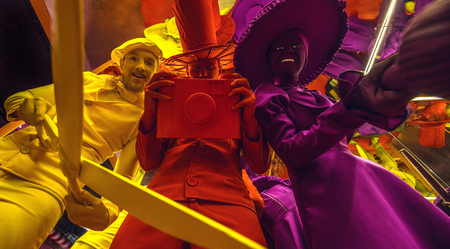 Group of stylized fantasy actors in scenic make-up and bright colored background.