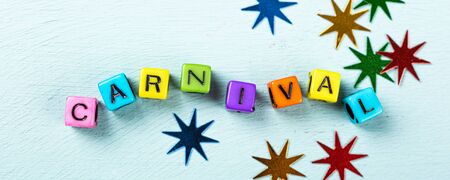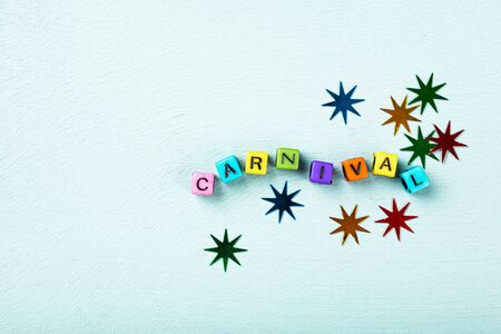 Lightbox with letters - HAPPY CARNEVAL - on colorful festive party decoration with steamers, confetti and ballons.