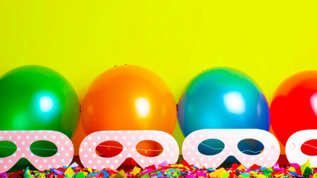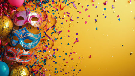 Yellow party background: balloons of different colors, masks and colored confetti. Carnivals, party and mardi gras background concept. Copy Space