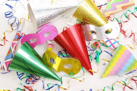 Party cone caps, streamers, pipes and carnival masks shot from above