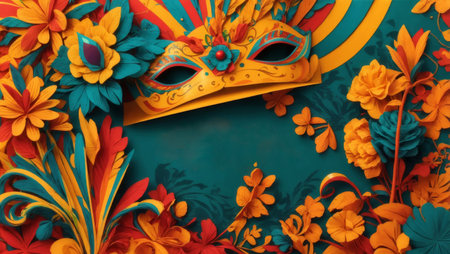 A colorful illustration that captures the essence of the Brazilian carnival, showing a decorated mask surrounded by flowers and festive elements on a yellow background