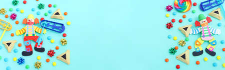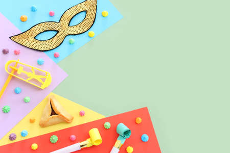 Purim, jewish carnival holiday celebration background. Top view, flat lay
