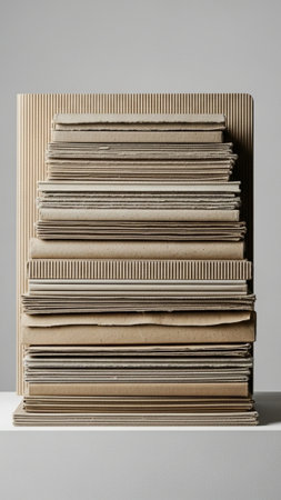 Various layers of corrugated cardboard are thoughtfully stacked, showing their unique texture and design. This arrangement highlights the potential for artistic creation and sustainable crafting.