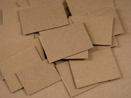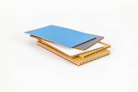 Cardboard showing assortment of corrugated cardboard boxes and sheets on white surface. High resolution image...