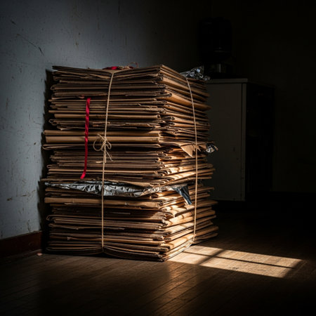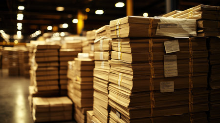An industrial warehouse scene featuring neatly stacked bundles of paper, illuminated by soft lighting, showcasing organization and efficiency within a bustling workspace.