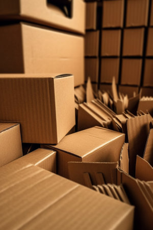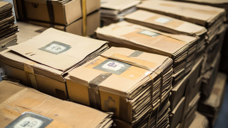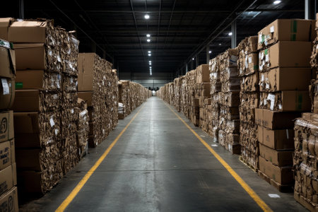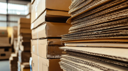 Stacks of corrugated cardboard boxes in a warehouse, representing packaging and shipping materials8