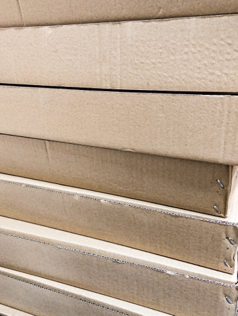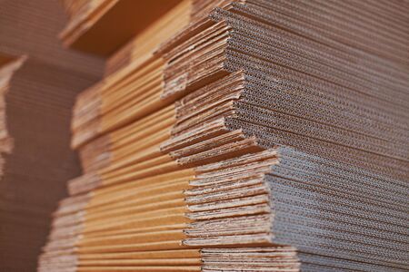 Close up of empty folded cardboard boxes. Background from cardboard boxes. Copy space.