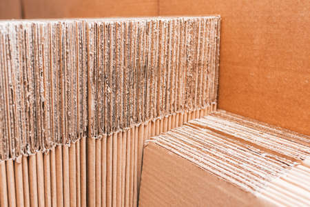 Corrugated Cardboard Edge Layers Textured Background. Carton Cut Slices Pattern with Copy Space, Ripped Kraft Paper Wallpaper, Brown Wrapping Vintage Paper Top View