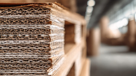 Stack of corrugated cardboard sheets in warehouse. Generative AI