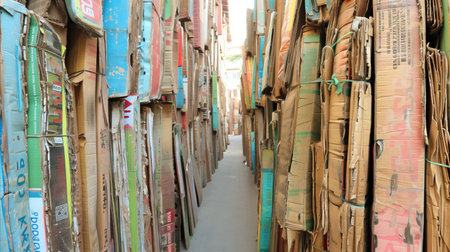 A narrow alley filled with towering piles of compressed cardboard, illustrating the magnitude of urban recycling and waste management challenges.