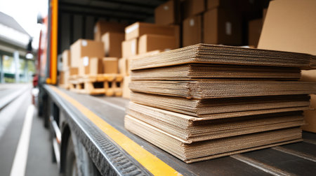 A close-up view of stacked cardboard sheets on a delivery truck, surrounded by packages for shipping. This image captures the essence of logistics and transportation services in action.