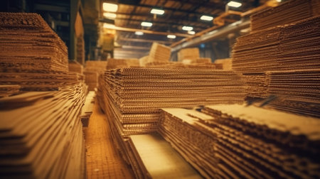 Industrial stacks of corrugated cardboard in clean facility, symbolizing sustainability, packaging, and shipping readiness.