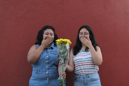 Young Latina sisters and friends, brunettes, give each other yellow flowers to show their love and the arrival of spring