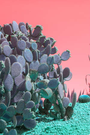 Surrealistic abstract cactus and succulent plants in arid landscape with pink red sky