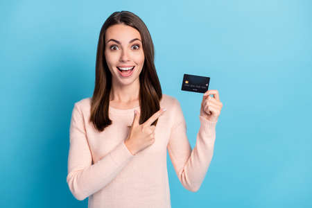 Young woman hand shows credit card for shopping online over blue background in studio. Copy space for place a text, message for advertisement. Advertising area, mockup promotional content.