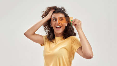 Young adult woman of 30 years old uses her credit card to take advantage of promotions and discounts on purchases, travel payments, beauty products, supermarkets and online