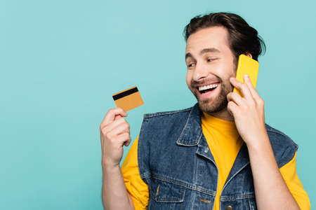 Smiling man talking on mobile phone and looking at credit card isolated on blue